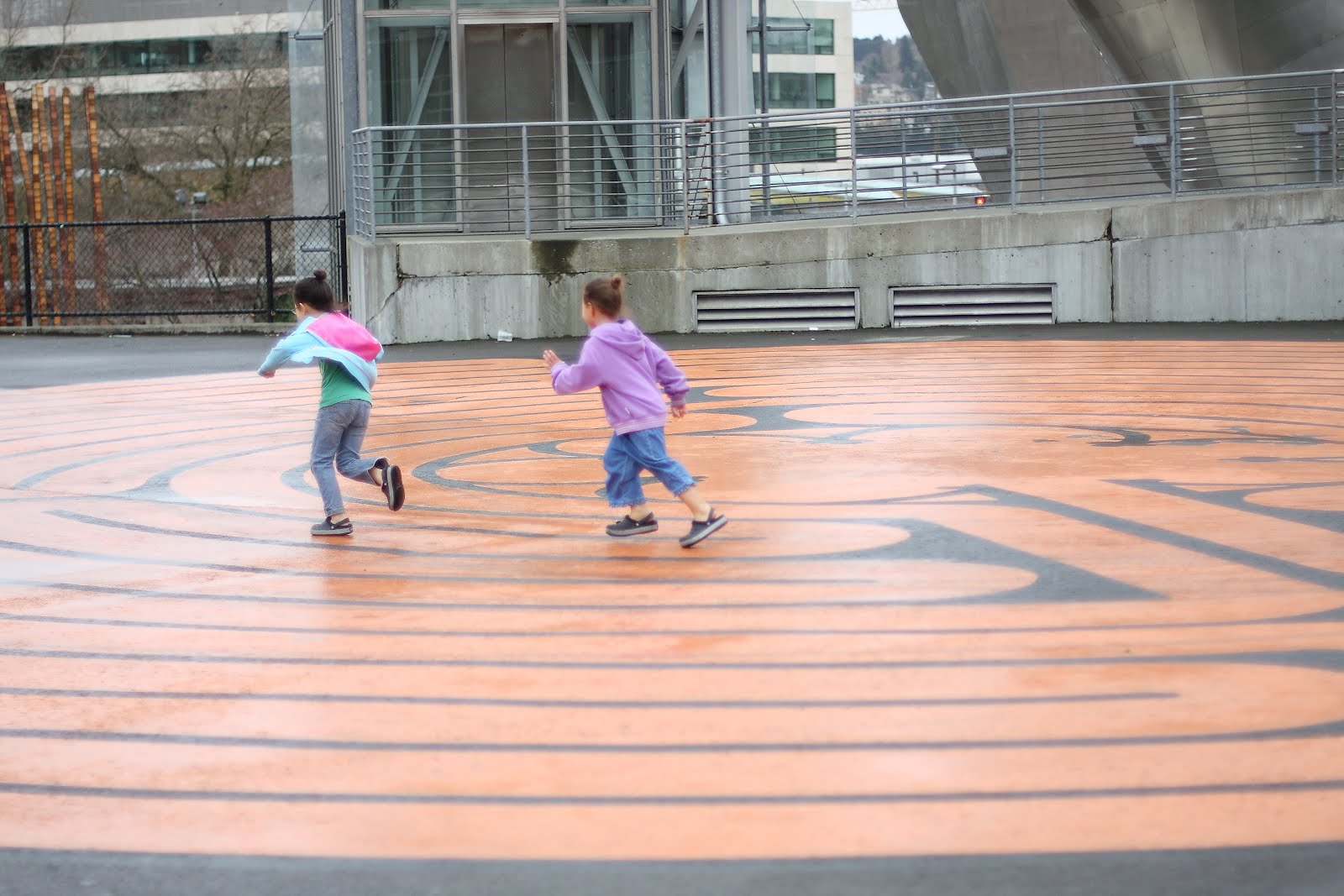 march 27 we walked to the space needle. i loved that our apartment was only a mile away. it was cold up there! we didn't stay long because we were all hungry and cold. we then went looking for lunch before going to the emp museum. we stumbled upon a really cool maze outside and the girls had a blast running from start to finish. :) the restaurant that we were looking for ended up being closed so we went inside the emp to use the bathroom and discovered a place to eat. it was good! then we toured the museum which was very cool!